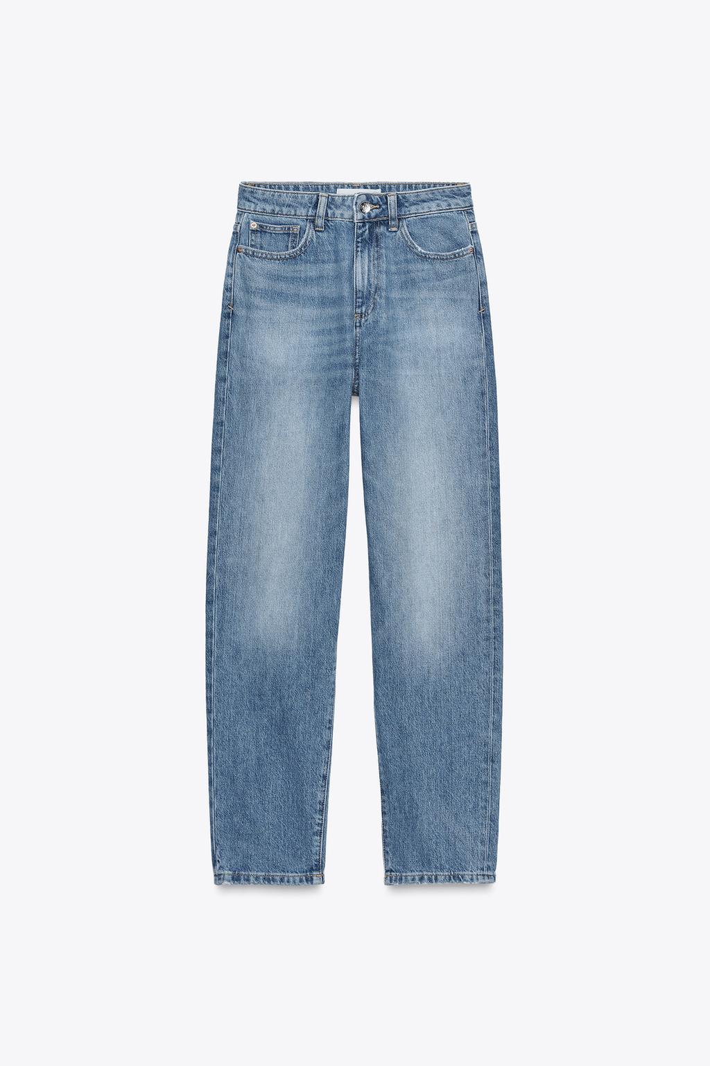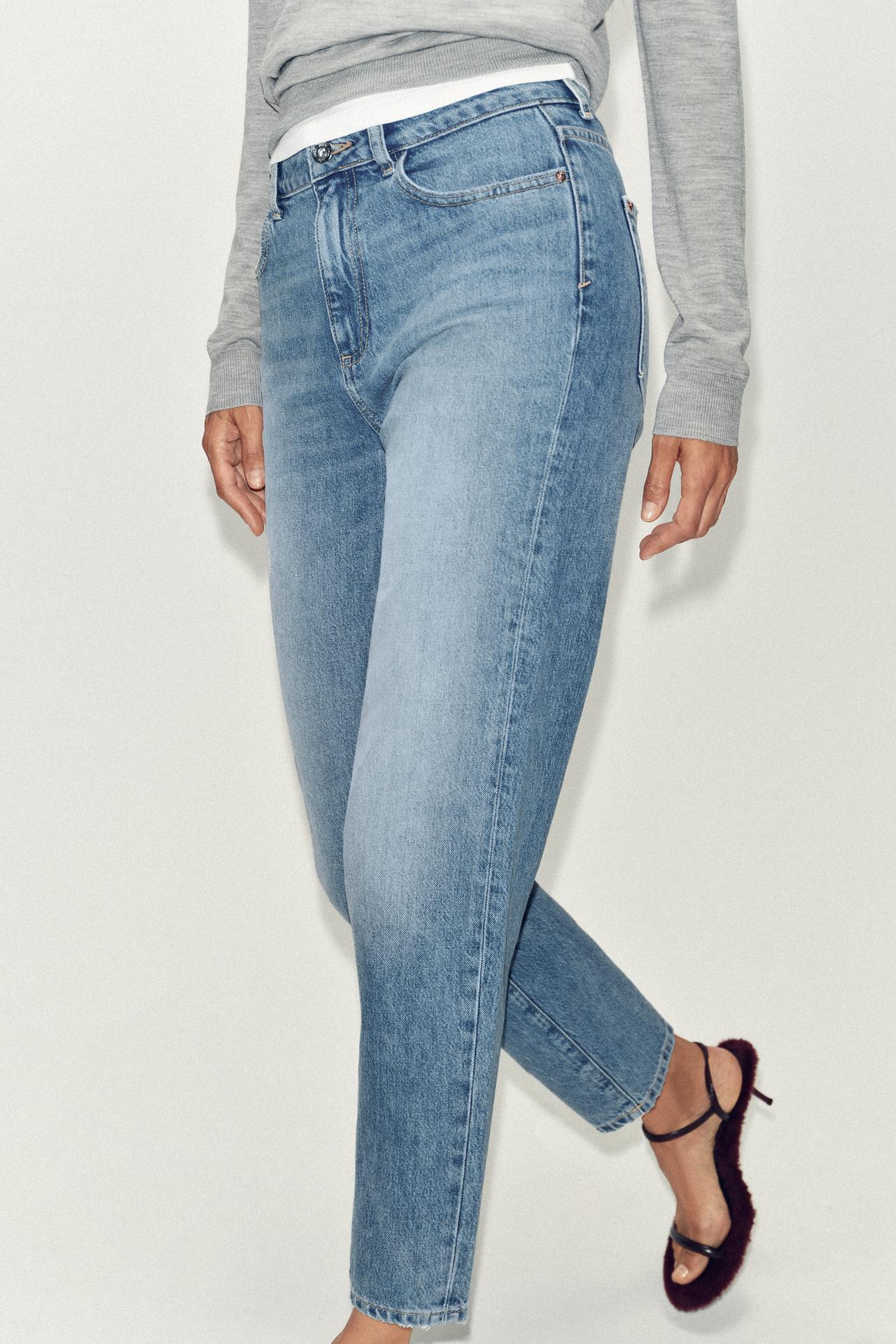 Jean taille haute avec cinq poches. Fermeture avant avec zip et bouton.
